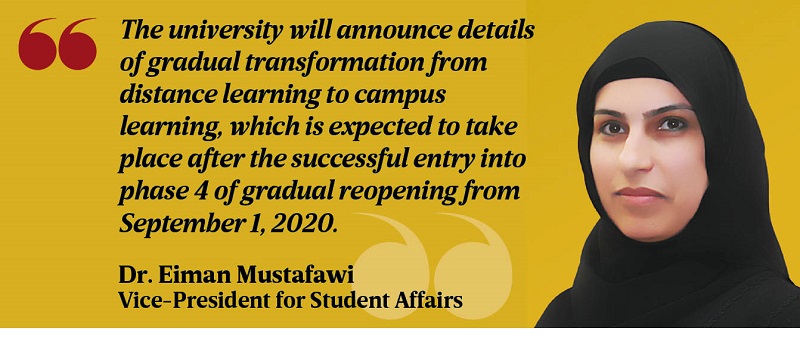 She added that the university will announce the details for further steps for a gradual transformation from distance learning to campus learning, which is expected to take place after the successful entry into the phase 4 of the country plan on 1 September 2020. Where the decision to study in the campus will be applied directly to all students, except Some categories of students, who are more susceptible to contracting the disease and its complications (chronic disease patients and pregnant women), and the exception remains in effect until the state announces the possibility of their return and any related procedures.