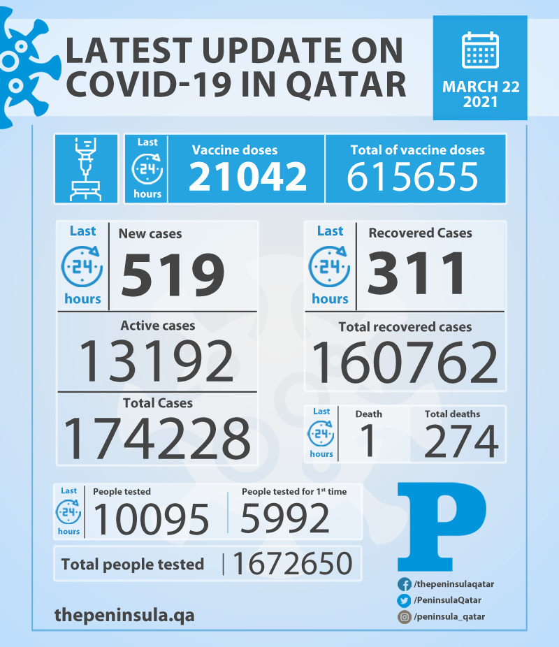 Doha: Ministry of Public Health (MoPH) today reported 519 new cases of coronavirus (Covid-19) and 311 people recovered from the virus in the last 24 hours, bringing the total number of people recovered in Qatar to 160,762.