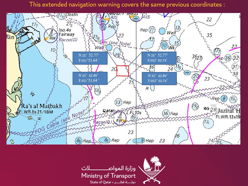 Doha, Qatar: The Ministry of Transport (MOT) announced that a navigation warning, published last March 18th and warned ships and maritime vessels to refrain from approaching the areas where hydrographic surveys are being conducted, has been extended and will remain in effect until May 15, 2026.