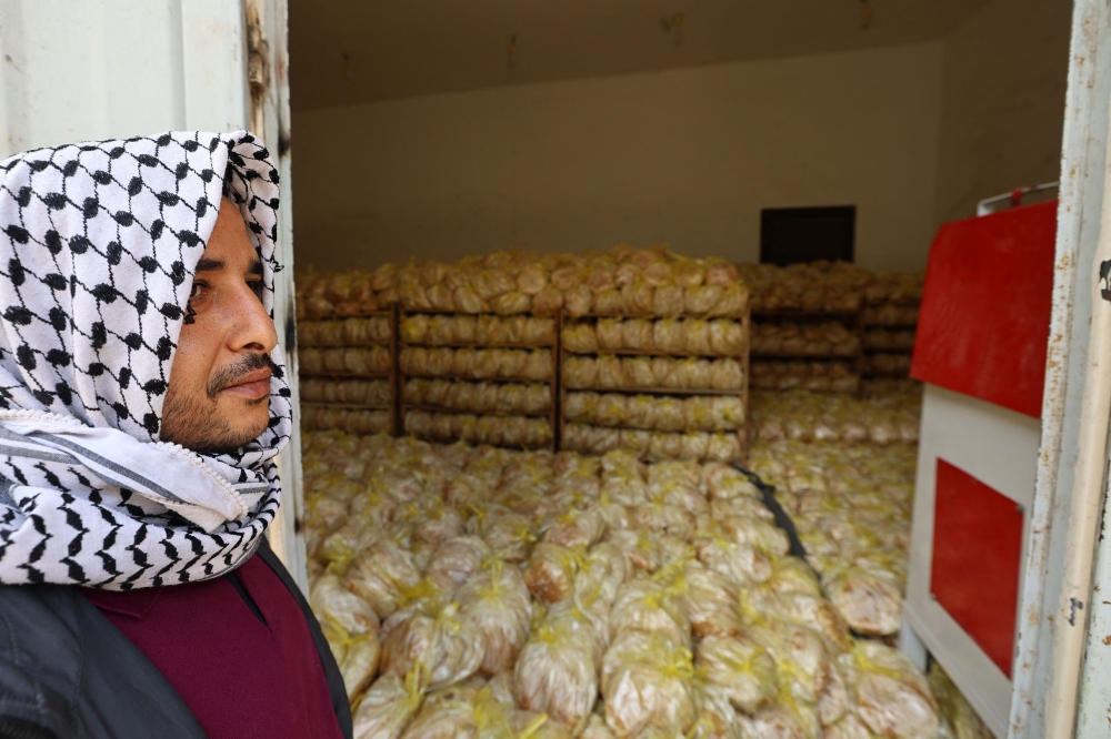 A man walks in front of bread piled up inside a bakery in Deir el-Balah in the central Gaza Strip on May 22, 2025. (Photo by Eyad Baba / AFP)