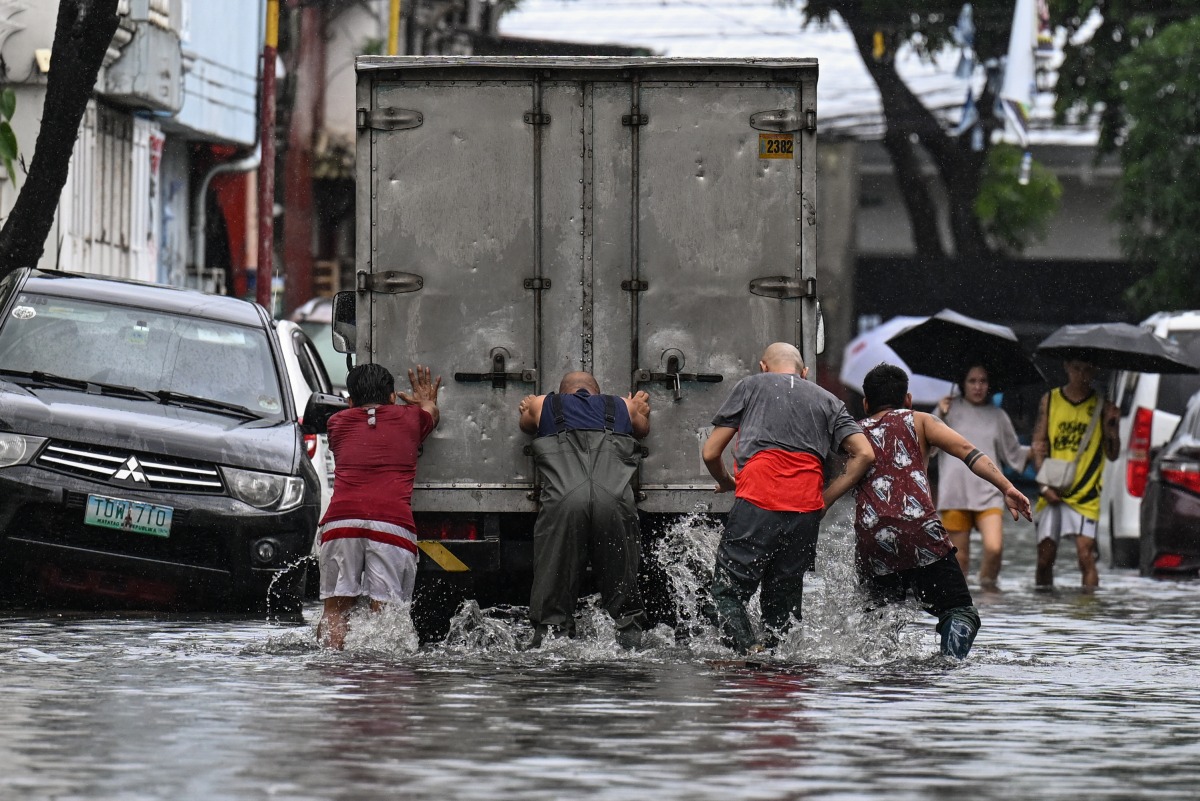 People push a truck through a flooded street in Manila on July 22, 2025, after heavy rains caused floodings enhanced by monsoon. Photo by Jam STA ROSA / AFP