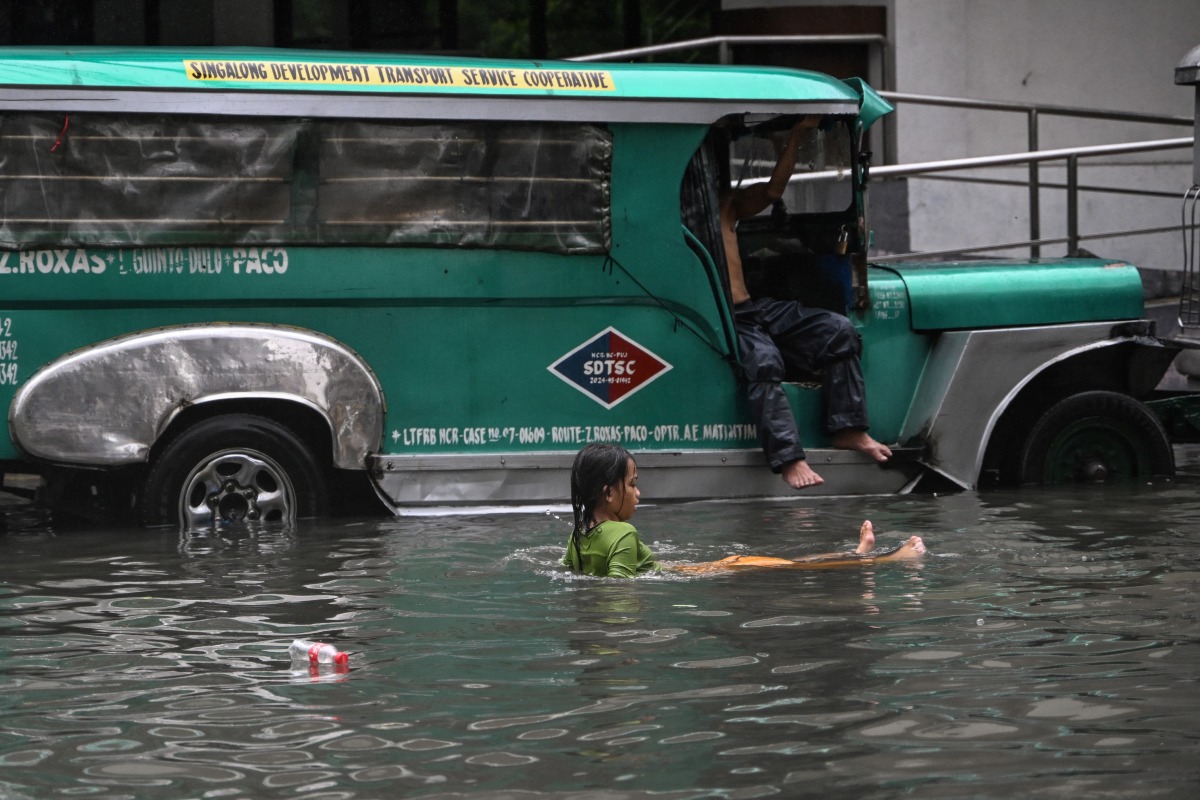A child swims through a flooded street in Manila on July 22, 2025, after heavy rains caused floodings enhanced by monsoon. Photo by Jam STA ROSA / AFP