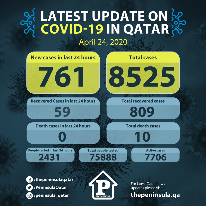 The total number of positive COVID-19 cases recorded in Qatar till now stands at 8525 and there are 7706 active cases under treatment. So far, 10 people have died from the coronavirus in Qatar. Ministry conducted 2431 tests in last 24 hours taking the total tests done so far to 75888 tests.