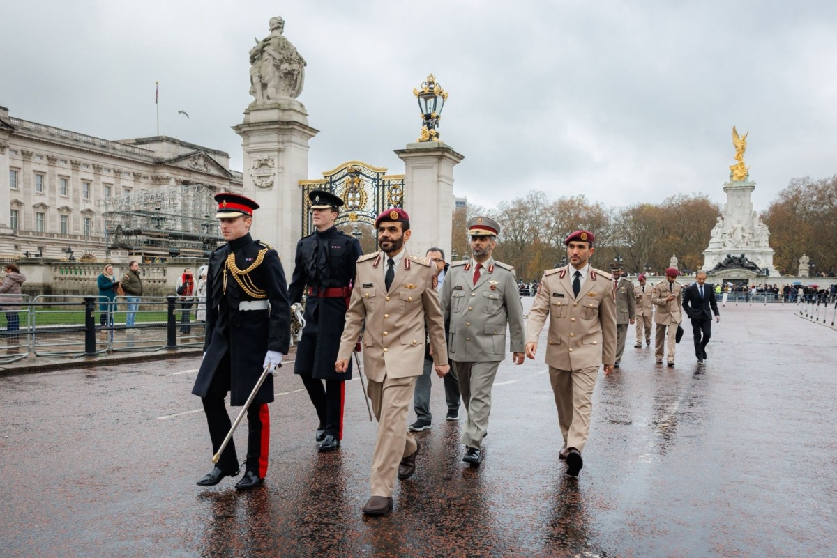 During the visit, HE the Amiri Guard Commander received a briefing on the operations and duties of the Royal Guards and observed a performance by the British Royal Guard Cavalry.