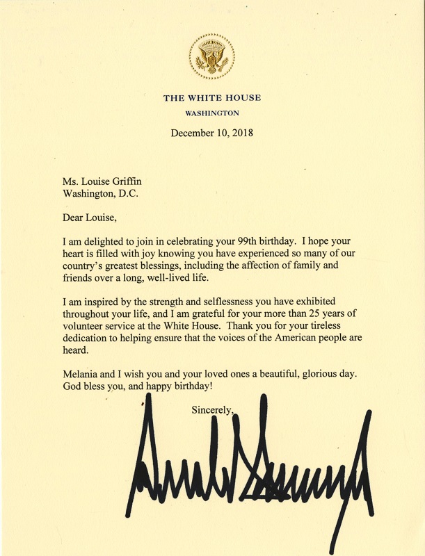 "I am inspired by the strength and selflessness you have exhibited throughout your life, and I am grateful for your more than 25 years of volunteer service at the White House. Thank you for your tireless dedication to helping ensure that the voices of the American people are heard."