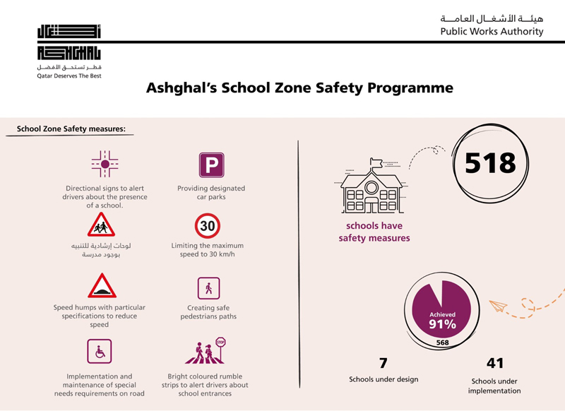 According to a study conducted by the Ministry of Education and Higher Education, Ashghal has coordinated with the Ministry of Interior and the National Road Safety Committee to identify school areas in need of development. This year priority was given to approximately 568 schools spread across various areas in Qatar.