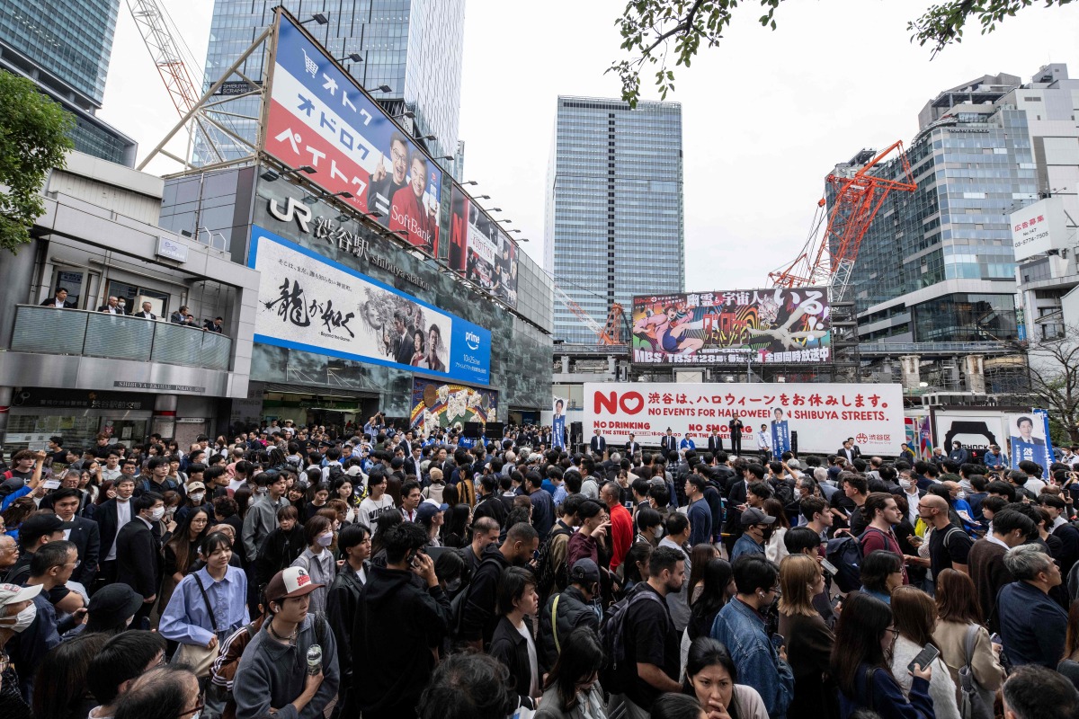 A police officer patrols with a police dog before an election campaign speech by Yoshihiko Noda, leader of the Constitutional Democratic Party (CDP), in front of Shibuya station in Tokyo on October 26, 2024. Photo by Yuichi YAMAZAKI / AFP