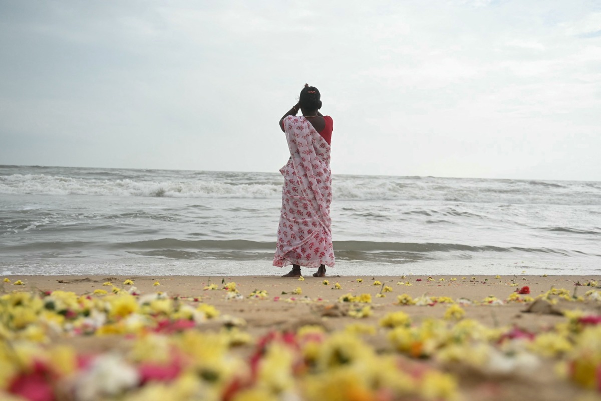 Flowers are scattered on the beach after women performed rituals during a ceremony held for the victims of the 2004 Indian Ocean tsunami, at Pattinapakkam beach in Chennai on December 26, 2024. Photo by R.Satish BABU / AFP