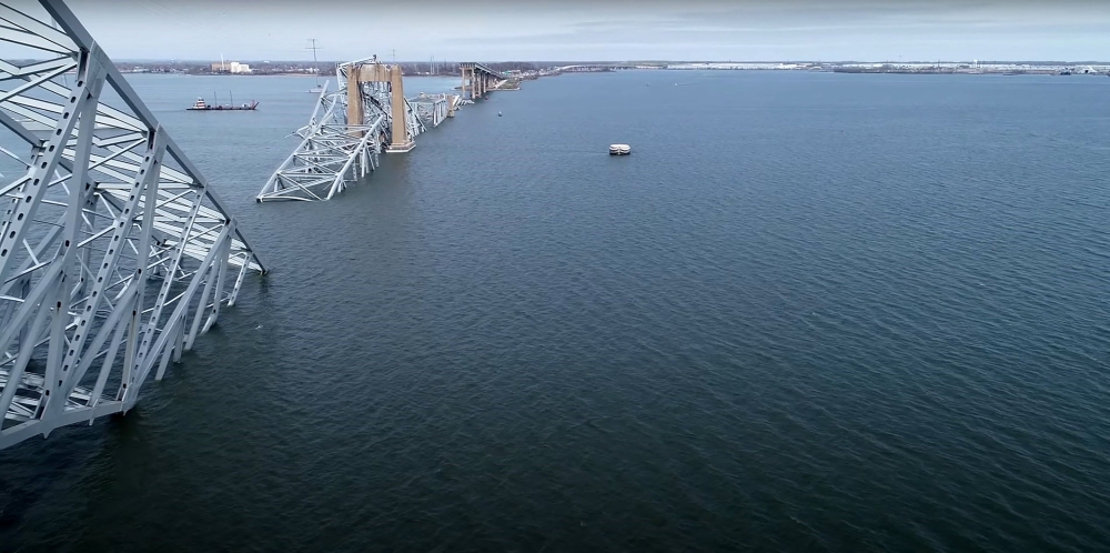 This handout screegrab courtesy of the National Transportation Safety Board taken on March 26, 2024, shows part of the steel frame of the Francis Scott Key Bridge sitting after the bridge collapsed in Baltimore, Maryland. Photo by National Transportation Safety Board / Youtube / AFP