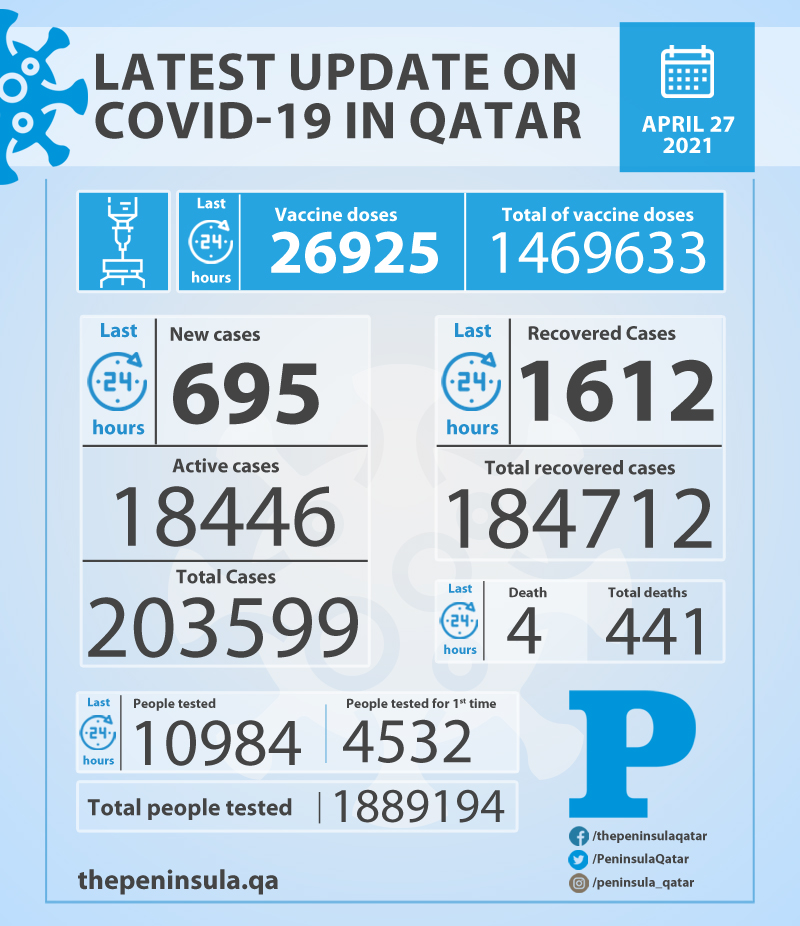 Doha: Ministry of Public Health (MoPH) today reported 695 new cases of coronavirus (Covid-19) and 1,612 people recovered from the virus in the last 24 hours, bringing the total number of people recovered in Qatar to 184,712.