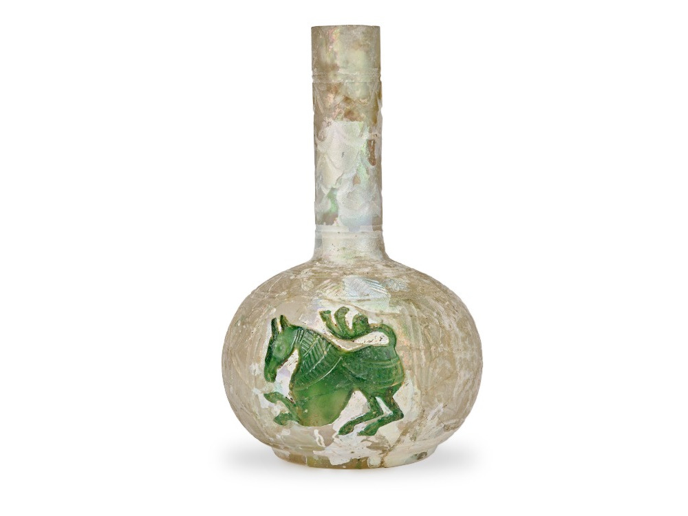 Iran or Central Asia Samanid period, 9th–10th century CE. Colourless glass with green glass overlaid patches and wheel-cut decoration. Museum of Islamic Art, Doha