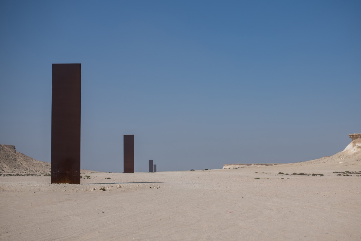 Qatar Museums unveiled Richard Serra’s major landscape commission, East-West/West-East, in April 2014. Set in a natural corridor formed by gypsum plateaus, East-West/West-East spans over a kilometre in length, and crosses the peninsula of the Brouq Nature Reserve, connecting the waters of the Gulf. East-West/West-East consists of four steel plates measured by their relation to the topography. The plates, which rise to 14.7 meters and 16.7 meters above the ground, are level to each other; they are also level to the gypsum plateaus on either side. Despite the great distance that the plates span, all four can be seen and explored from either end of the sculpture. East-West/West-East is the second installation by the world-renowned artist Richard Serra; it follows the artist’s first public artwork in the Middle East, 7, which was installed in MIA Park in 2011.