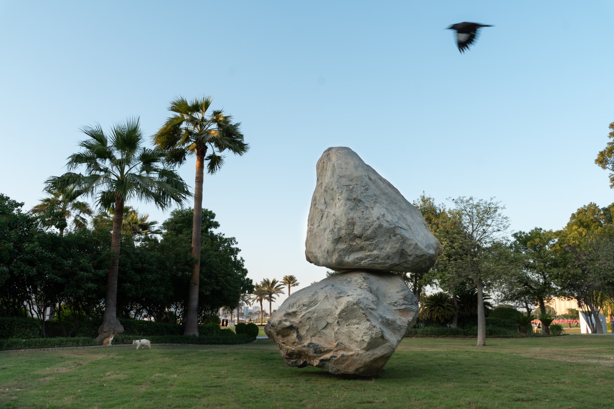Positioned near the entrance to ALRIWAQ, Rock on Top of Another Rock by Peter Fischli & David Weiss introduces two massive granite boulders in seemingly precarious balance, with one resting atop the other. Standing approximately 5.5 metres (18 feet) high, the sculpture embodies a deceptively simple gesture that oscillates between the binaries of stability and instability, construction and destruction. First installed in London’s Kensington Gardens in 2013 as part of the Qatar-UK Year of Culture, its presence in Doha extends this cultural dialogue, showing how artistic exchange can bridge geographies and inspire reflection.