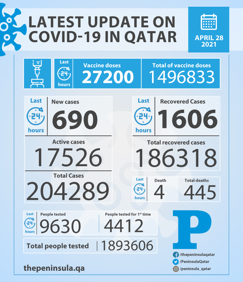 Doha: Ministry of Public Health (MoPH) today reported 690 new cases of coronavirus (Covid-19) and 1,606 people recovered from the virus in the last 24 hours, bringing the total number of people recovered in Qatar to 186,318.