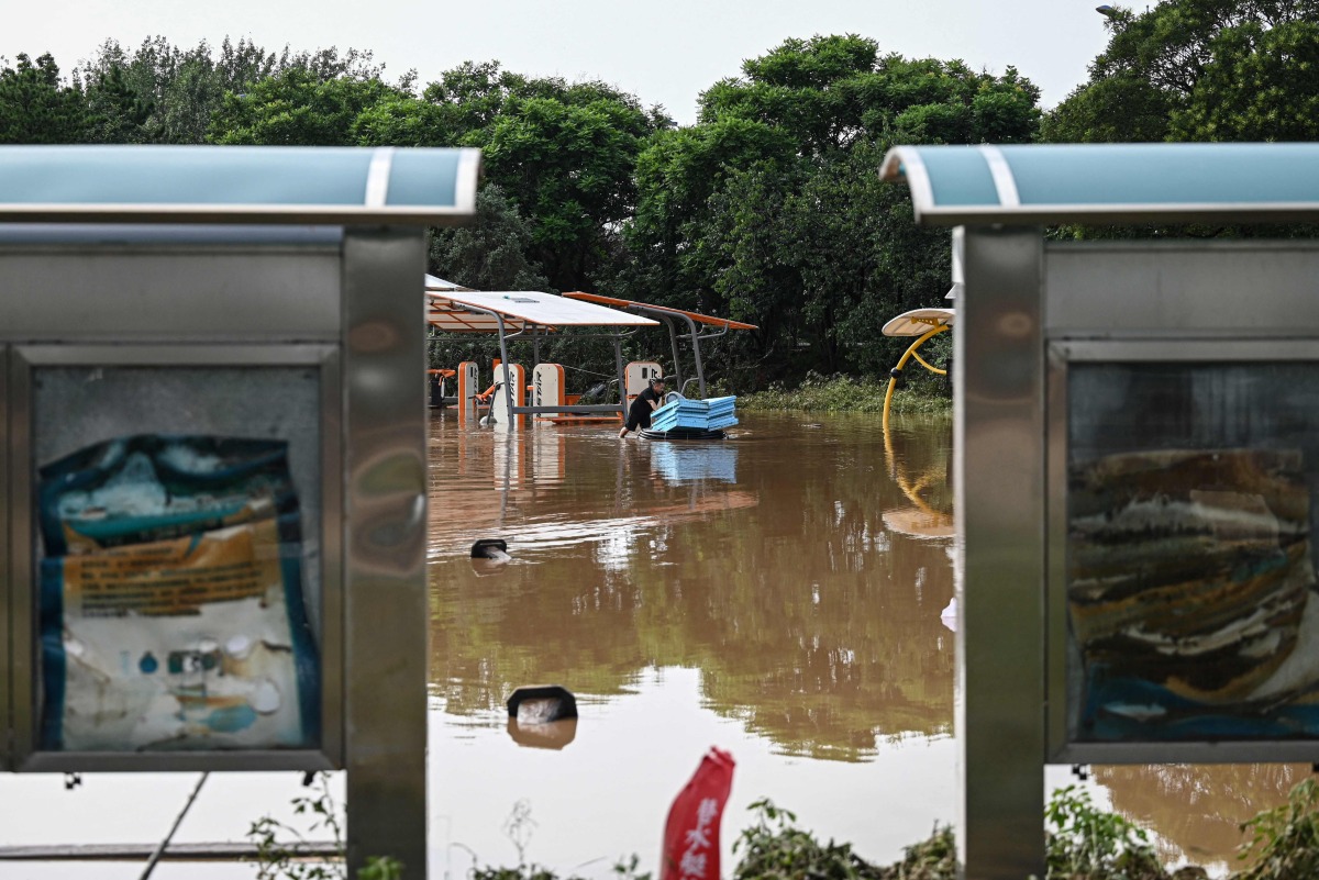 A man transferring items walks through a flooded area after heavy rains at Taishitun village in Miyun district, on the outskirts of Beijing on July 28, 2025. Photo by Jade GAO / AFP