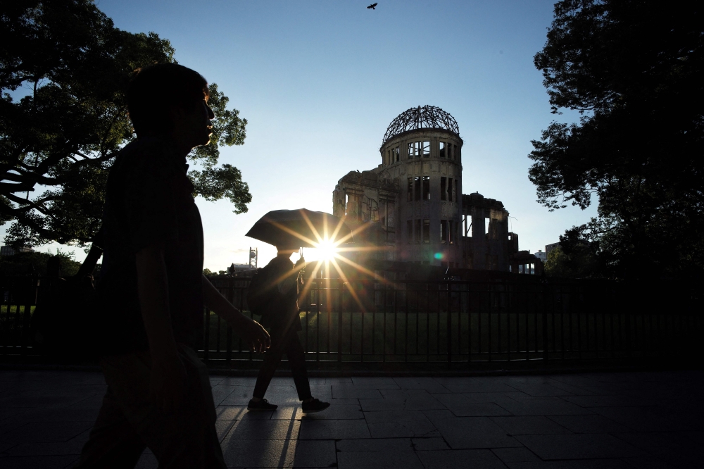 This photo taken on August 5, 2023 shows pedestrians walking past the Atomic Bomb Dome beside the Hiroshima Peace Memorial Park in Hiroshima, ahead of the 78th anniversary of the world's first atomic bomb attack on August 6. Photo by Kazuhiro NOGI / AFP