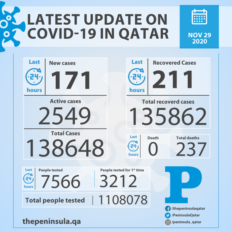 Doha: Ministry of Public Health (MoPH) today recorded 171 new cases of coronavirus (COVID-19) and 211 people recovered from the virus in the last 24 hours, bringing the total number of people recovered in Qatar to 135,862.