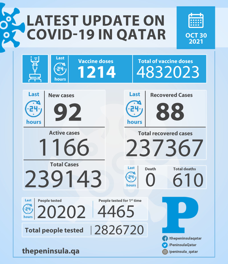 Doha: Ministry of Public Health (MoPH) today recorded 92 new cases of coronavirus (COVID-19) and 88 people recovered from the virus in the last 24 hours, bringing the total number of people recovered in Qatar to 237,367.