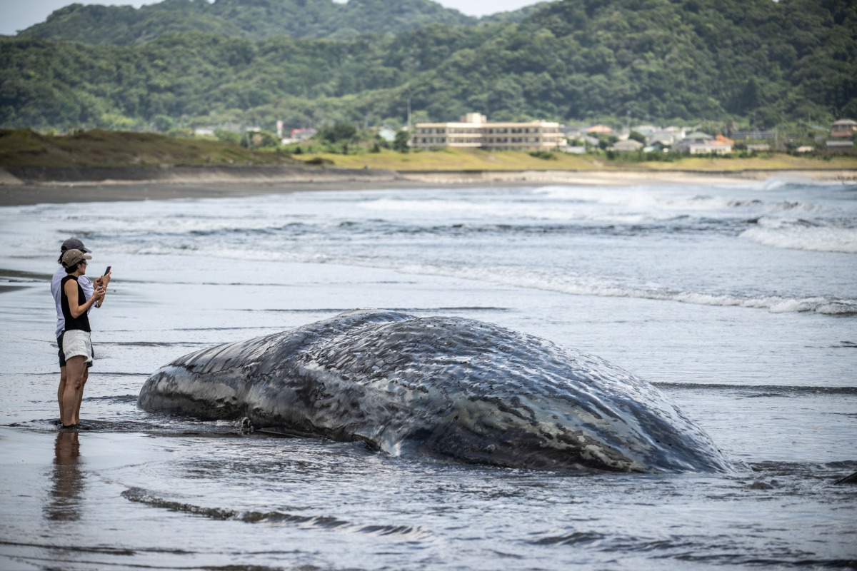 People look at a dead whale on Heisaura Beach in the city of Tateyama, Chiba Prefecture on July 31, 2025. (Photo by Philip FONG / AFP)